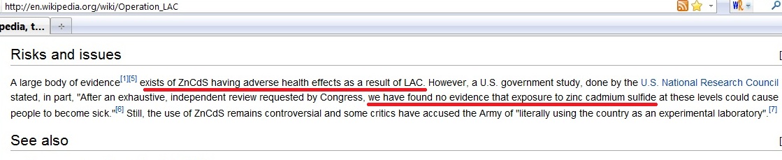 Mentre il Governo ha insistito nell’affermare l’innocuità di tale composto chimico, il cadmio è riconosciuto come una causa di cancro al polmone e durante la Seconda Guerra mondiale esso fu considerato dagli Alleati come un’arma chimica.